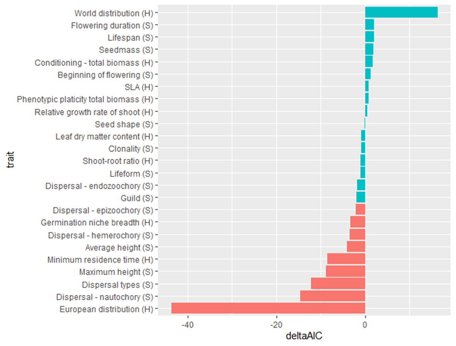 Results: From all our data, we selected 25 important soft and hard traits, and performed phylogenetic generalized linear models with binomial error distribution to find out which traits are important in distinguishing invasive species from less successful alien species. Nine traits were proved to be important in single-predictor models: the European distribution of species having the highest influential score. Dispersal traits, height, germination niche breadth and minimum residence time (the time since introduction) were also important traits in this respect. Mostly the soft traits (those that can be readily extracted for all species without long-term studies) can be used in risk assessment protocols.